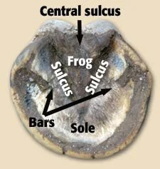 Thrush is a bacterial infection that involves the central and lateral sulci of the frog. The horses foot has some natural self cleaning mechanisms which can be hindered by conformation, such as upright or contracted feet with deep sulci, lameness, lack of exercise and wet environmental conditions. The bacteria which can cause thrush are in the manure and soil where your horse lives and can get lodged into the areas around the frog, and in the right conditions, start an infection. The signs of thrush include a foul odor, black discharge and possibly lameness.